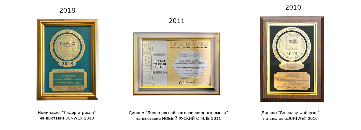 Сочетание благородных металлов, драгоценных камней, высокое качество исполнения, сложность технологий, оригинальность и эксклюзивность моделей ювелирных изделий подтверждается дипломами и наградами российских и международных ювелирных выставок, а также благодарными отзывами наших партнёров и клиентов.